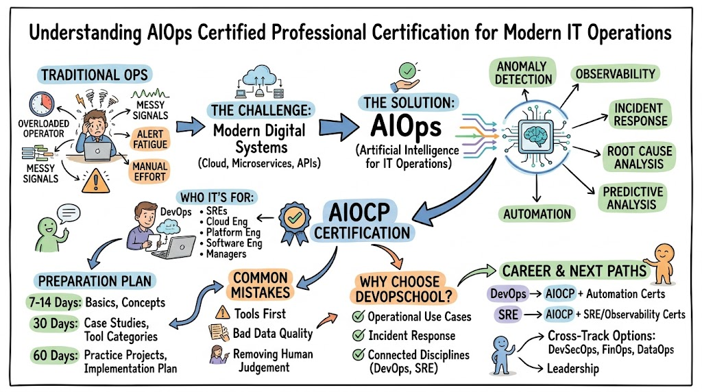 The AiOps Certified Professional (AIOCP) certification helps engineers and managers understand how artificial intelligence can support IT operations in a practical way. It brings together monitoring, automation, observability, incident response, and intelligent analysis so teams can work with more speed and clarity. This guide is written for working software engineers, cloud professionals, DevOps practitioners, SREs, platform teams, and managers who want to understand the real value of AIOCP. The goal is to explain the certification clearly and show how it fits into today’s production-focused engineering world.